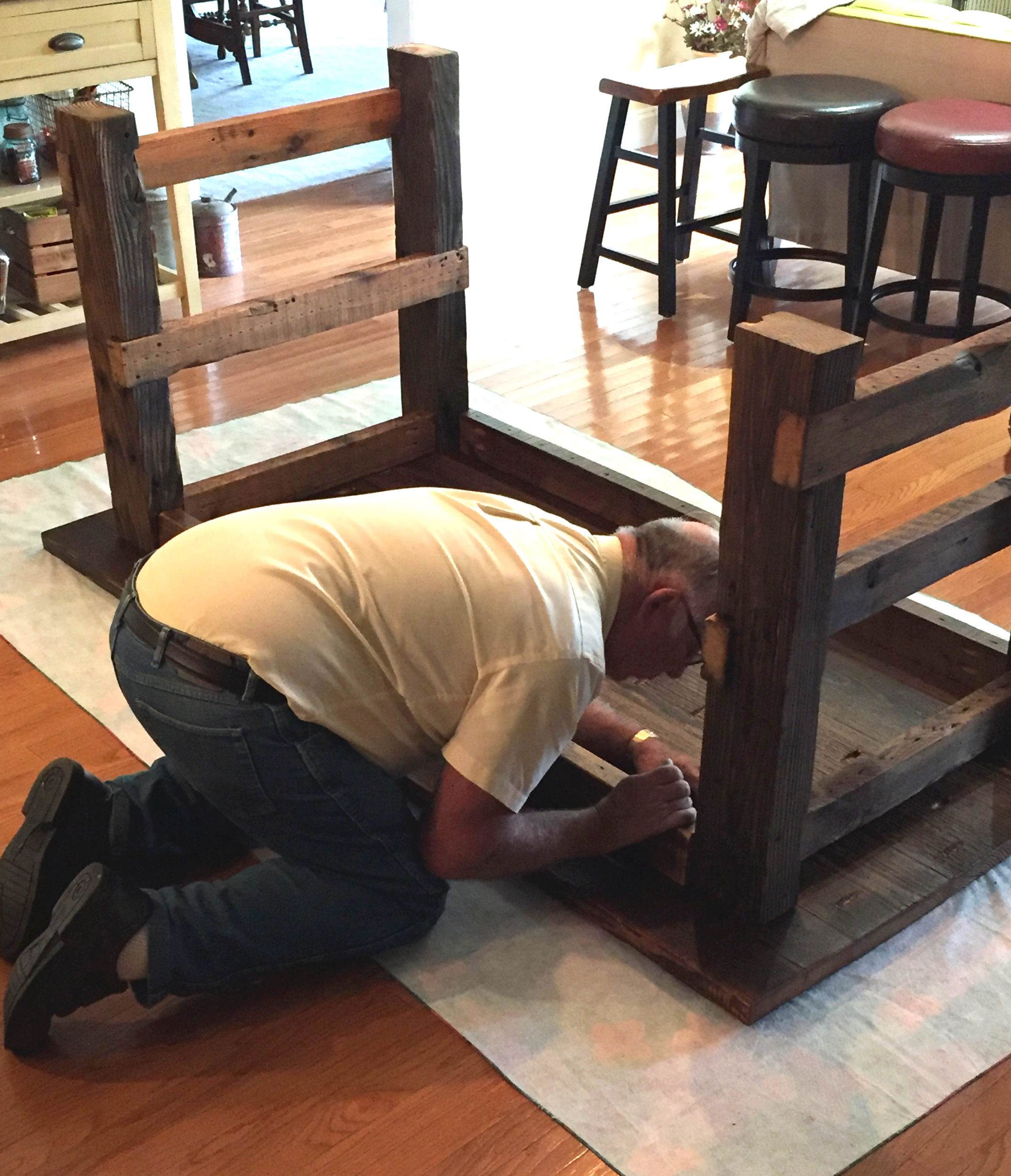 Dad had thoroughly thought through(that was a tongue twister!) how to put it together so that it would hold up well. After the base was attached, we flipped it back over and installed the shelves. Oh my goodness! I was beaming!!! This table… that took hours of hard work… was finally sitting in my kitchen! It was perfect. I couldn’t have asked for anything better!