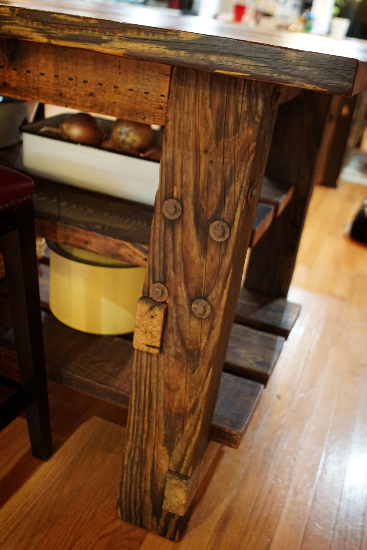 This table is amazing! The history of this wood comes from ages past, when farm buildings were made from wood, not steel. Oh how I miss the old barns and corncribs! The table top and shelves come from an old corncrib. The chunky 6×6 legs came from an old cattle feeder that was on my uncle’s farm, the bolts are even original! Some of the cross braces came from another barn that was torn down, and all these buildings were within 5 miles of the farm where I grew up.