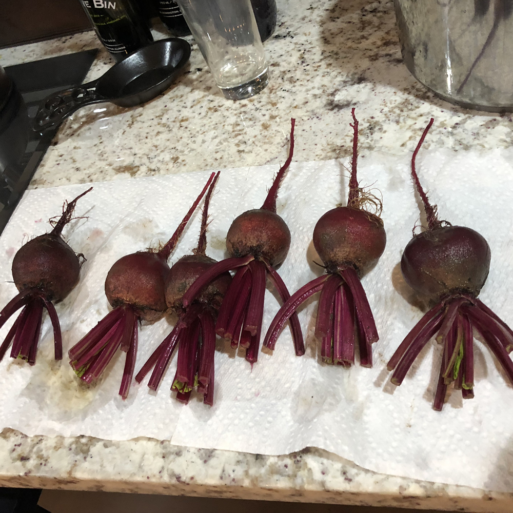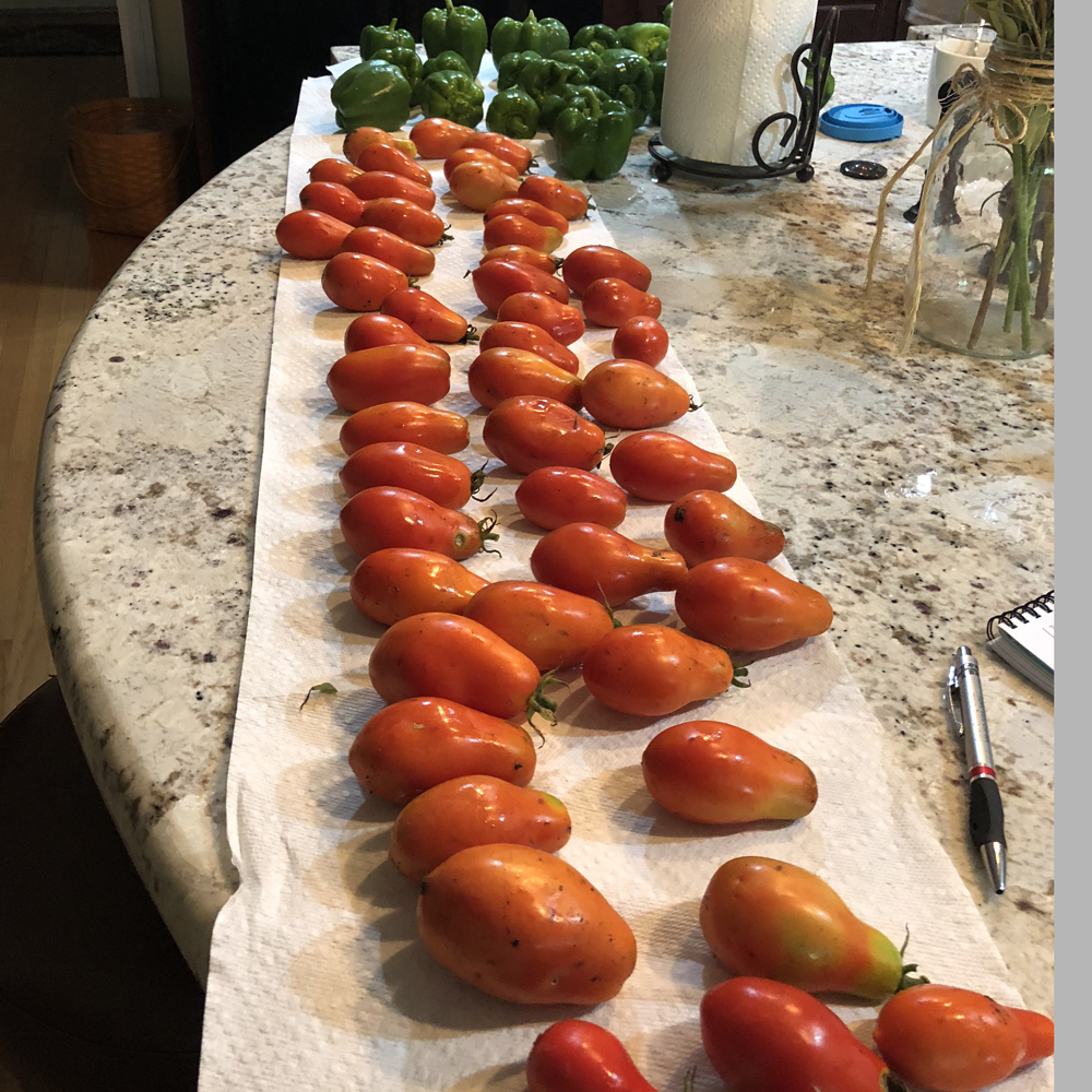 Our green beans came on early this year, so they were completely done. Any beans left on the plants were oversized or brown. The zucchini and cucumbers were hit by beetles and there weren’t enough on the vine to make up a plate of 5. Topping off the half bushel baskets with other produce than our usual standbys, we take them inside to cull through the large selection of vegetables to choose the best. Then after everything was washed and prepped, we ended up with beets, cherry tomatoes, acorn squash, green peppers and a pumpkin. We separate them into baggies so they are easy to transfer quickly onto the plates at check in. Finally, to get ourselves cleaned up and to the fair grounds so we’re not late!